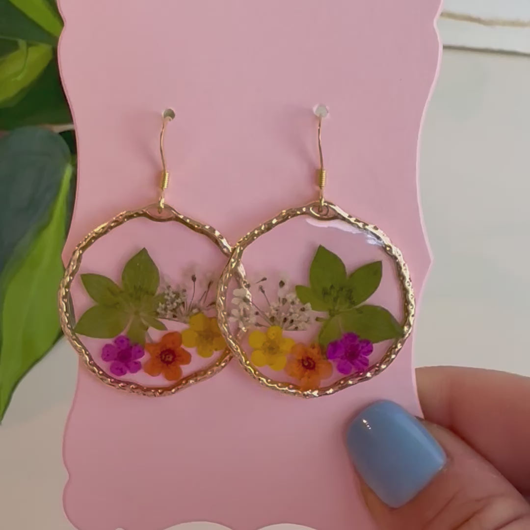•18k Gold Plated •Real hot pink, orange, and yellow flowers •Handmade •1.5 inch Diameter