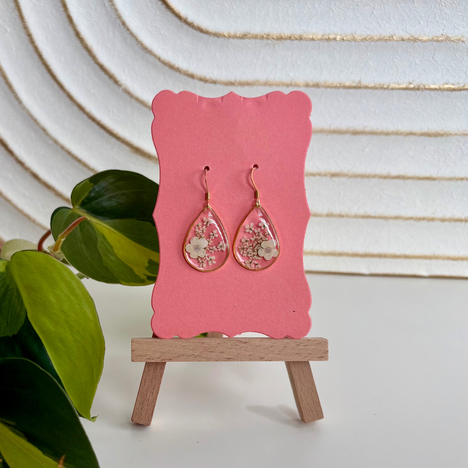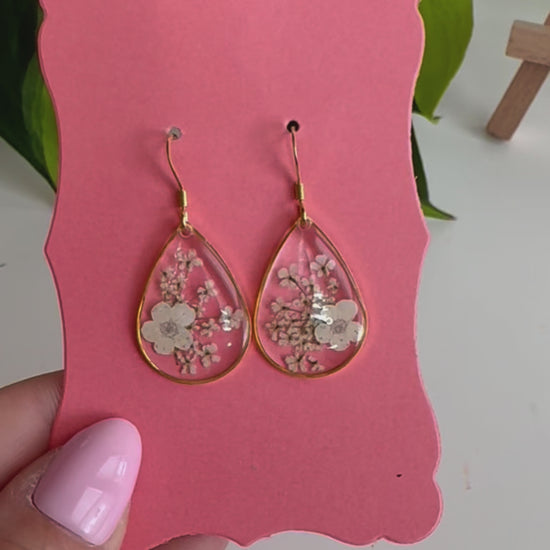 •18k gold plated •Real white and pink flowers •Handmade •Hypoallergenic posts