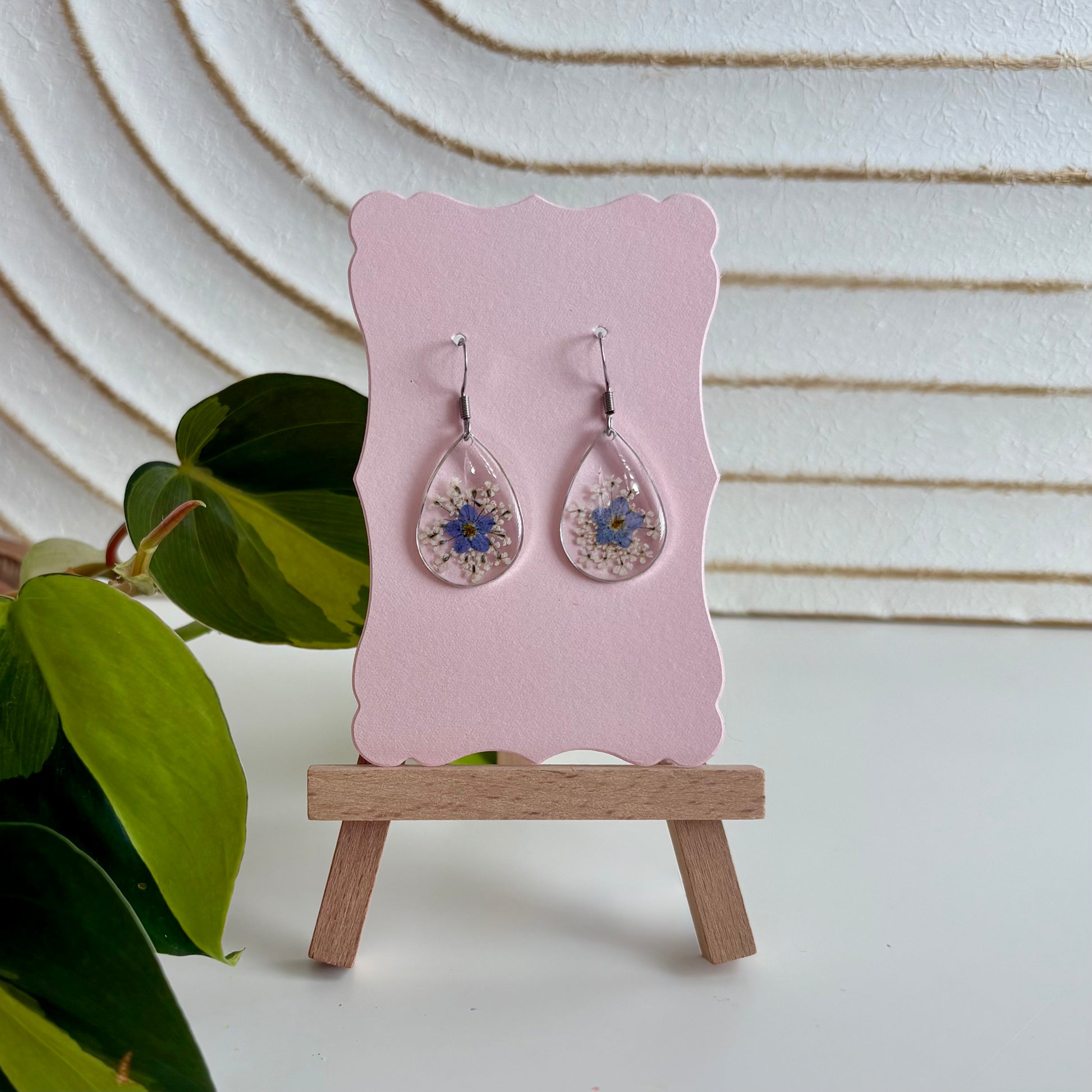 •Stainless Steel •Real white and blue flowers •Handmade •Hypoallergenic posts