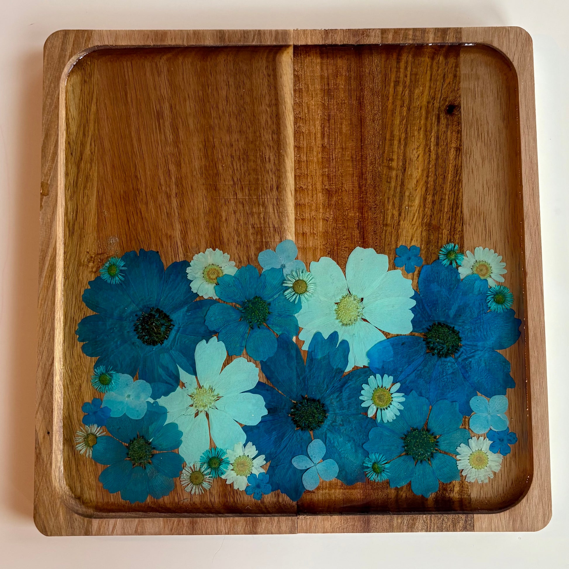 Material: Acacia Wood, Dried Pressed Flowers, Epoxy Resin